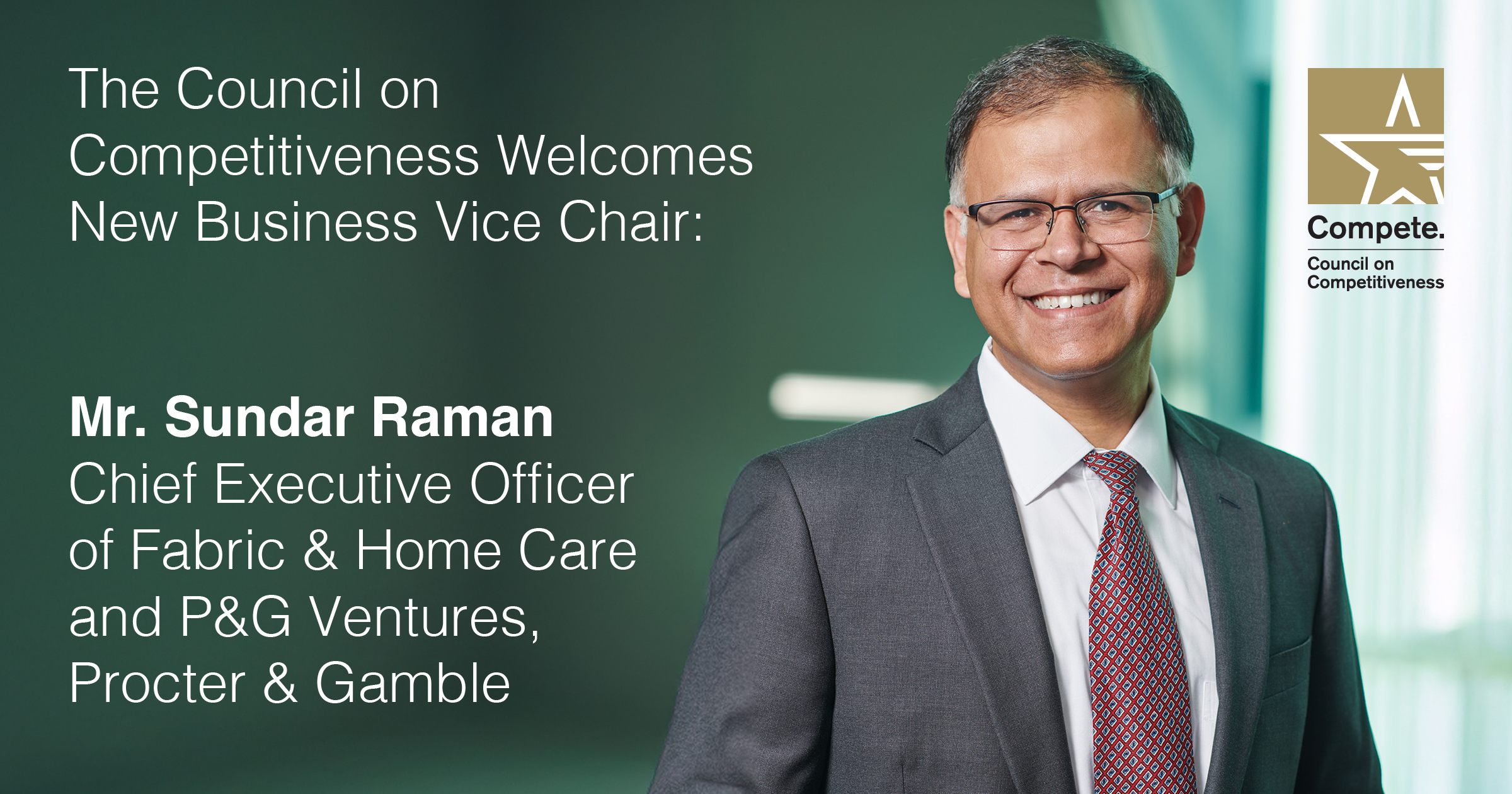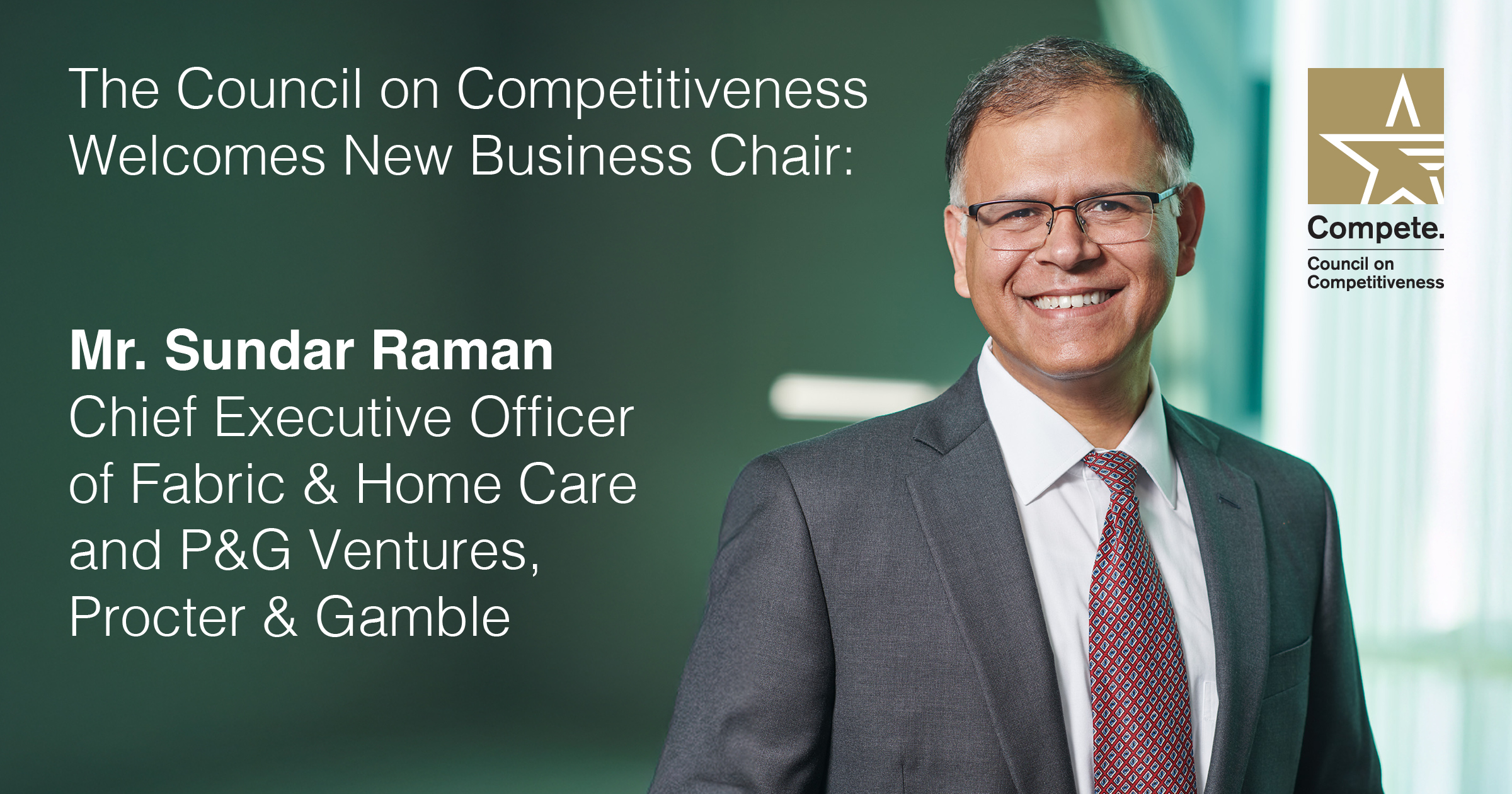 The Council on Competitiveness is thrilled to welcome Sundar Raman, CEO of Fabric & Home Care and P&G Ventures at Procter & Gamble, as our new Business Vice Chair.
